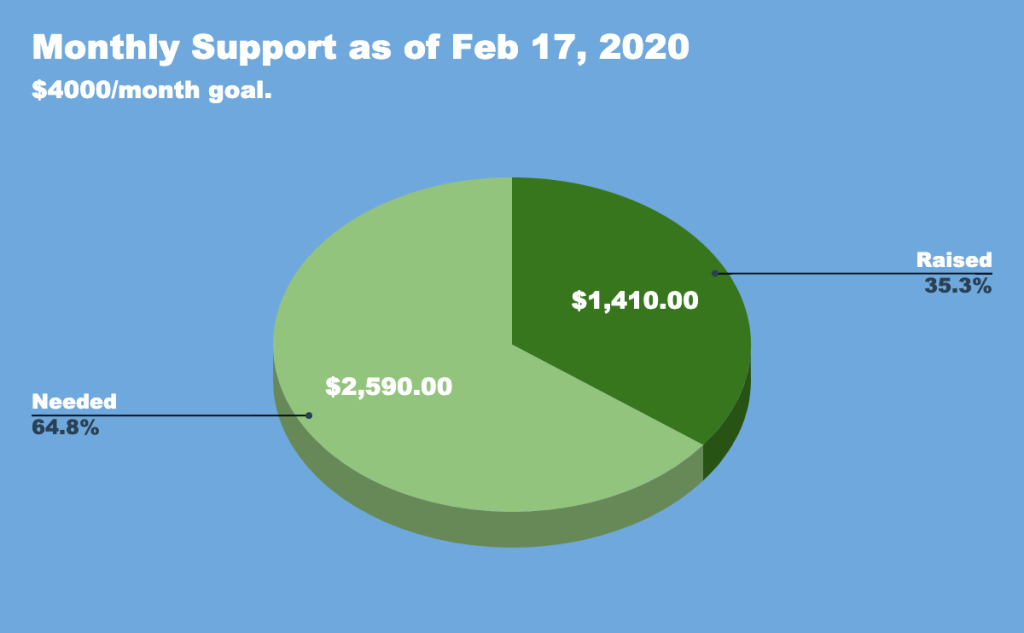 The biggest boost for us this month comes in the form of monthly support. We are in awe of our awesome God as he almost doubled the amount of support from 18.7 to over 35 percent!